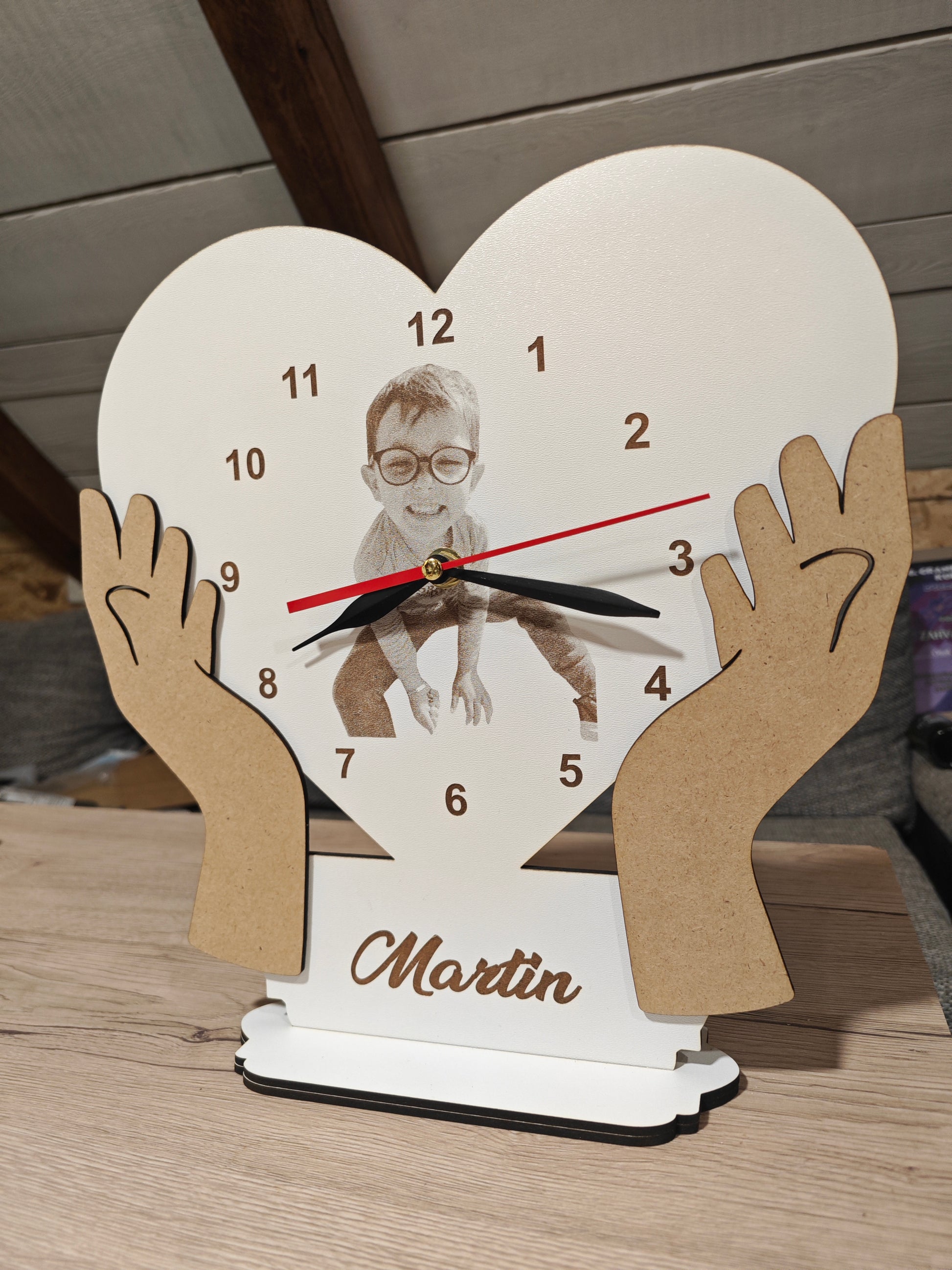 🎨 Personalizacija: 🔹 Ugravirat ću tvoju fotografiju visoke kvalitete 🔹 Dodajem imena, broj godina, datume, poruke – sve po tvojoj želji 🔹 Moguće je birati dekorativne oblike (srca, cvjetovi, elegantni lukovi itd.) 🔹 Svaki sat je unikatan i izrađen ručno